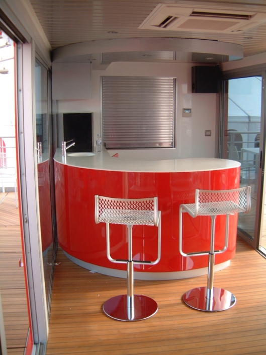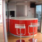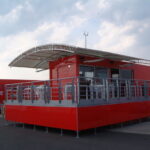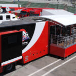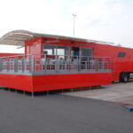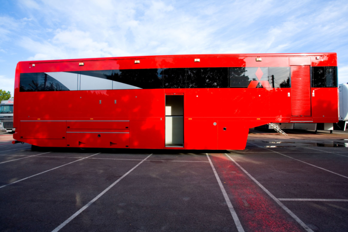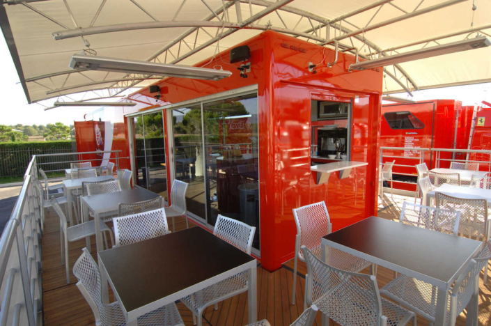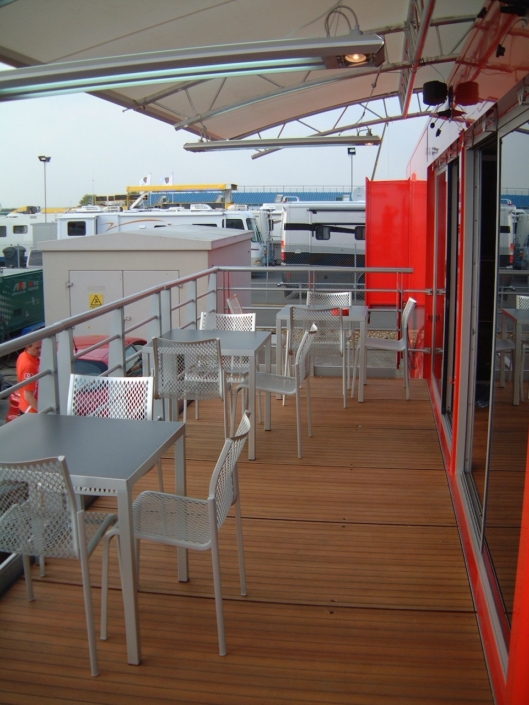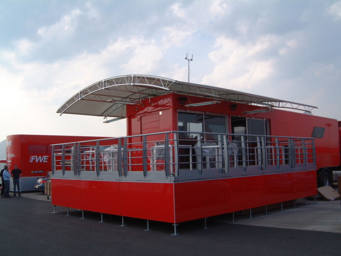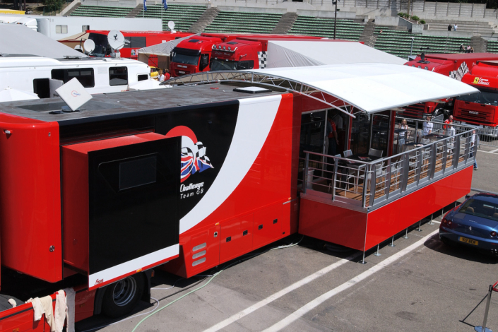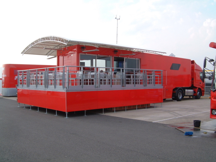 Ferrari UK required a state of the art hospitality unit to host the drivers and teams participating in the Ferrari Challenge. The concept that was presented to Ferrari UK included a hospitality area, a driver changing and showering facility, together with an executive office area. The main feature of the unit was the large covered veranda which provided an extension to the hospitality area and a raised vantage point to watch the racing events. Based on a 13.6m articulated trailer, the unit had its own power generator and was fully air conditioned internally.